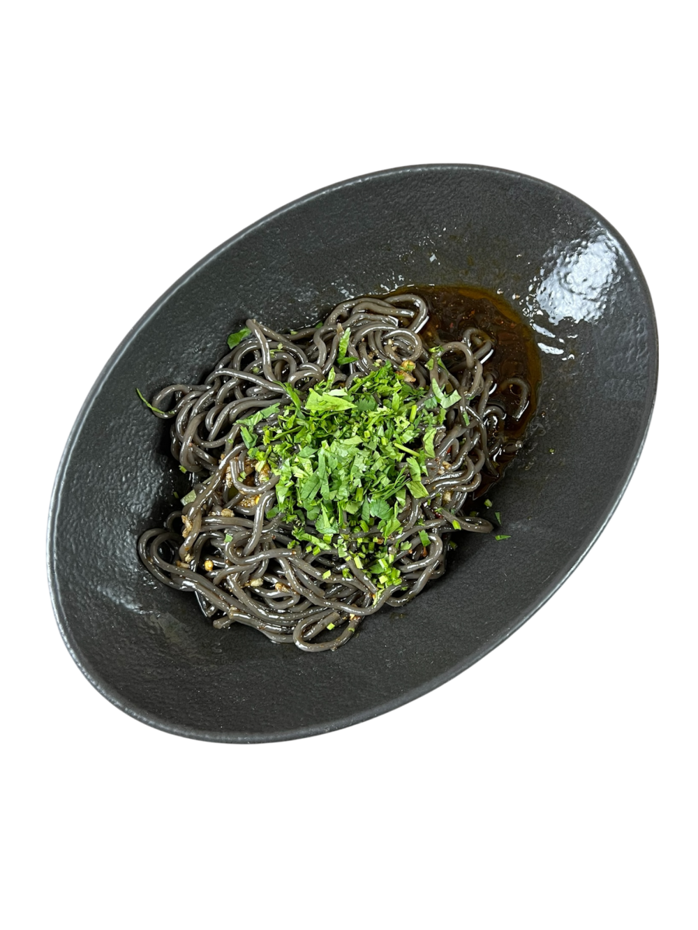 Эластичная фунчеза с яркой кисло-острой заправкой и зеленью.