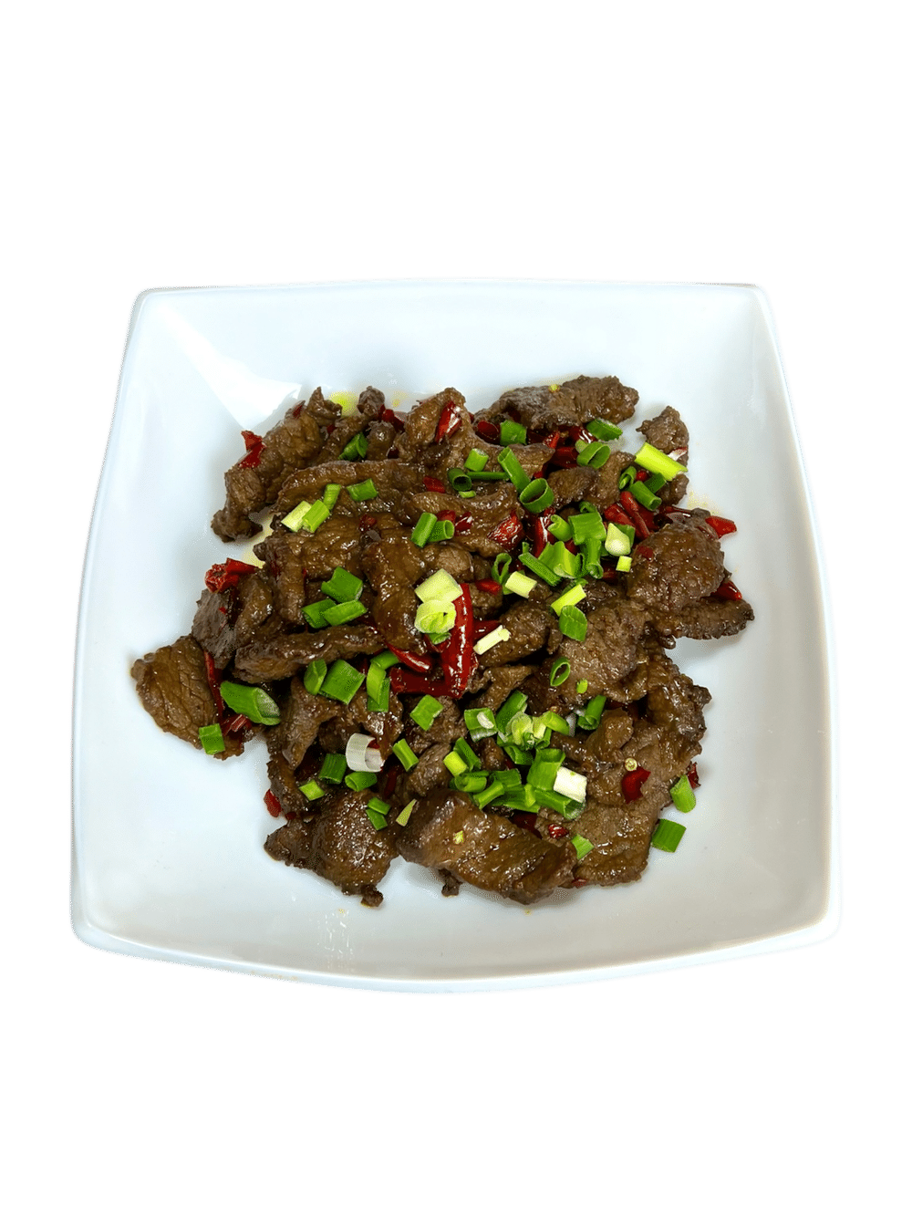 Нежную телятину, нарезанную лепестками, обжаривают с острым сушеным перцем.
