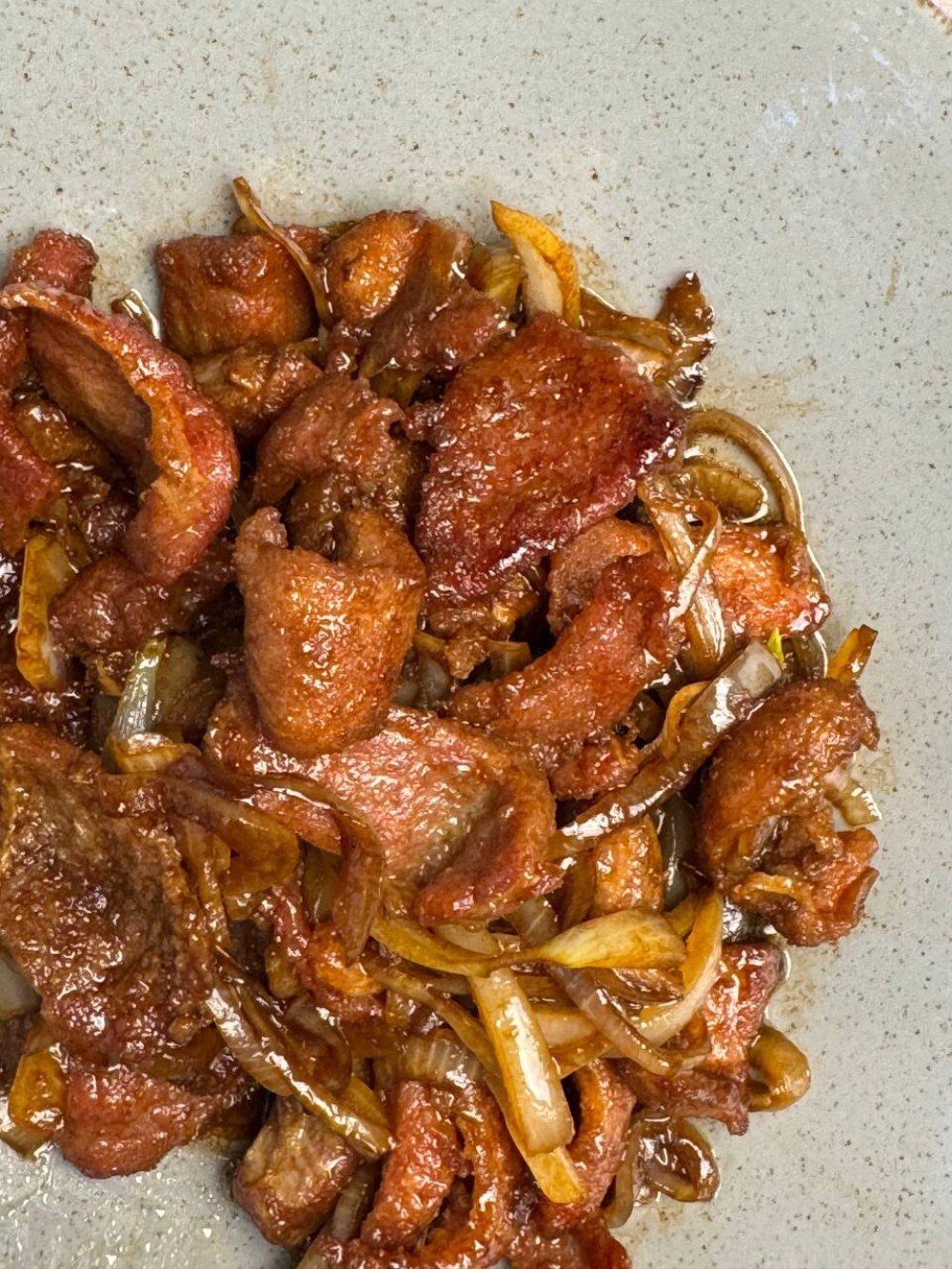 Нежную телятину, нарезанную тонкими лепестками, обжаривают со свежим репчатыми луком.