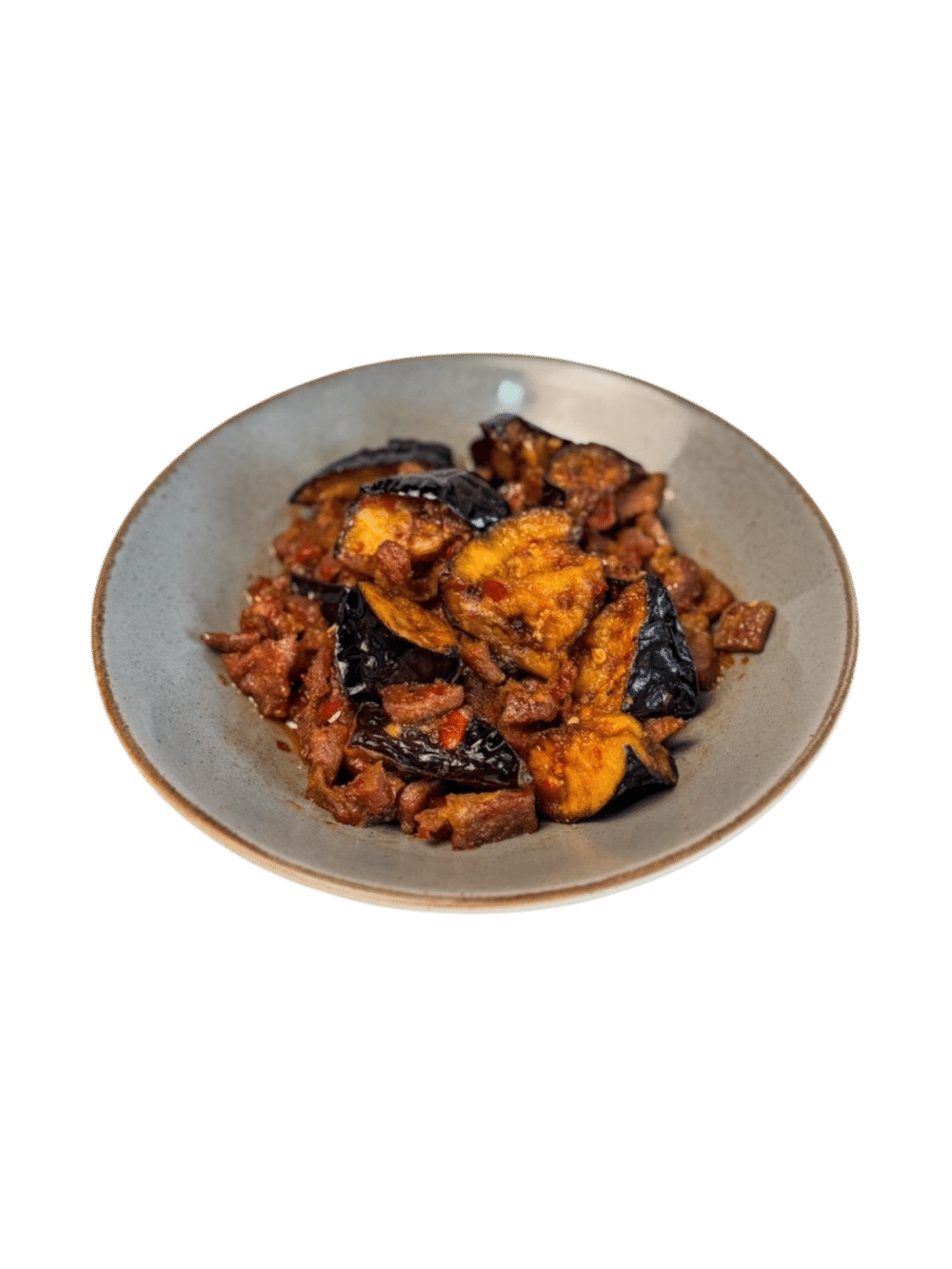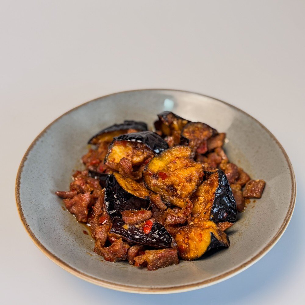 Телятина, нарезанная кубиками, жареная с баклажанами в фирменном соусе