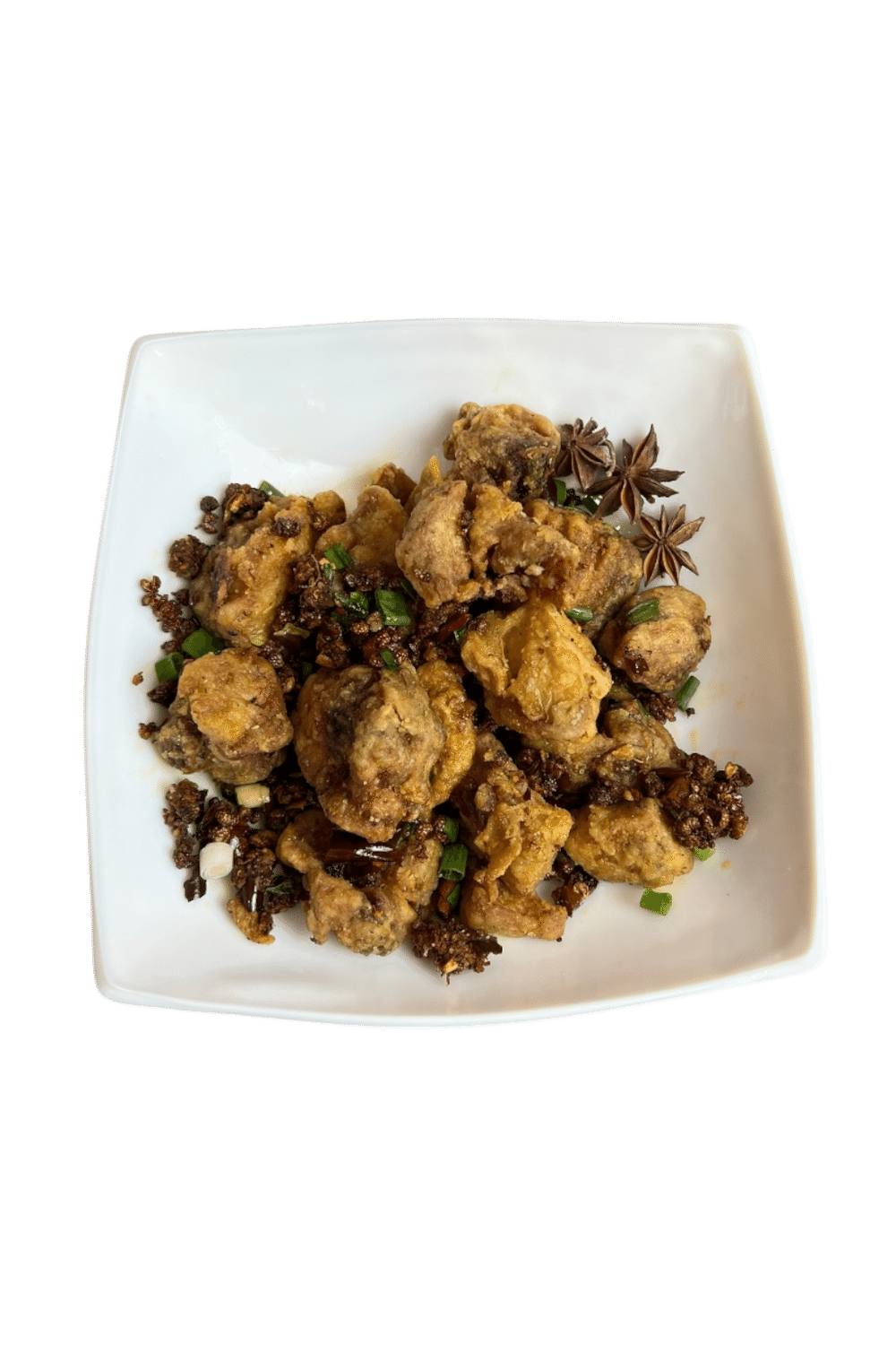 Курицу, нарезанную кусочками, обжаривают в нежном кляре с острым сушеным перцем и китайскими специями.