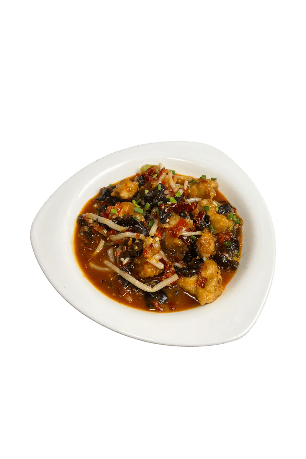 Филе куриное с грибами муэр и побегами бамбука в ярком кисло-сладко-остром соусе.