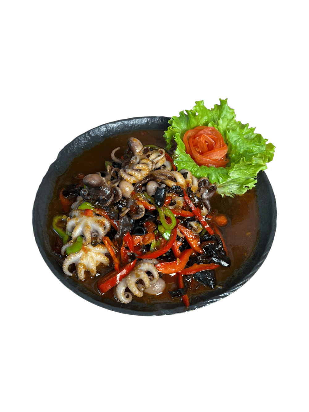 Морской деликатес: осьминожки с хрустящими грибами, бамбуком и перцем в пикантном соусе.
